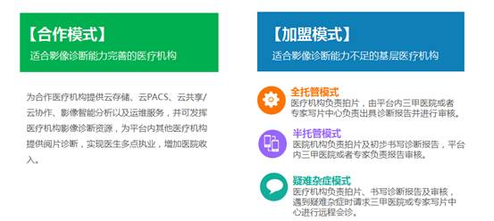 其次,針對不同醫(yī)院影像業(yè)務(wù)的實(shí)際難題的不同,平臺(tái)具備多種服務(wù)模式,可滿足不同醫(yī)院的業(yè)務(wù)需求。針對影像診斷能力較強(qiáng)的醫(yī)院,采用“合作模式”,為醫(yī)院提供云存儲(chǔ)、云PACS、云共享/云協(xié)作、影像智能分析以及運(yùn)維服務(wù)。并可發(fā)揮醫(yī)療機(jī)構(gòu)影像診斷資源,為平臺(tái)內(nèi)其他醫(yī)療機(jī)構(gòu)提供閱片診斷,實(shí)現(xiàn)醫(yī)生多點(diǎn)執(zhí)業(yè),增加醫(yī)院收入。針對影像診斷能力較弱的醫(yī)院,采用加盟模式,并提供全托管、半托管、疑難雜癥模式供選擇,形成了多種模式并行的影像運(yùn)營服務(wù)體系。