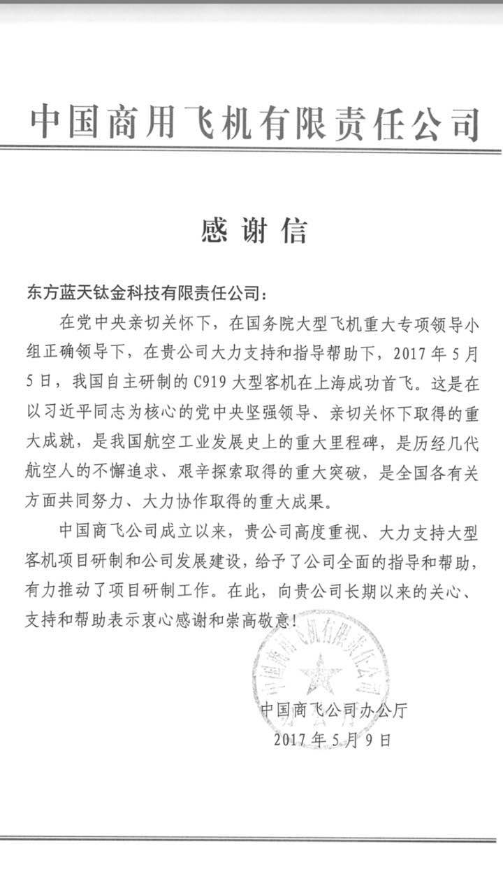 2017年5月9日,中國衛(wèi)星所屬子公司鈦金科技收到來自中國商飛的一封感謝信,信中對鈦金科技高度重視、大力支持大型客機(jī)項(xiàng)目研制和中國商飛發(fā)展建設(shè)及為C919大型客機(jī)首飛成功做出的重要貢獻(xiàn)表示衷心感謝和崇高敬意。
